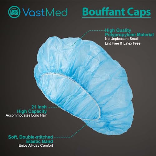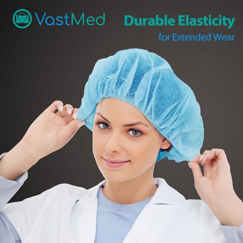 50 Pcs Disposable Bouffant Caps Hair Net by Vastmed | Non-Woven Elastic Head Cover Polypropylene Cap | Head Cover for Sleeping Food Service Spa Kitchen | Size 21″ – 35GSM, Blue